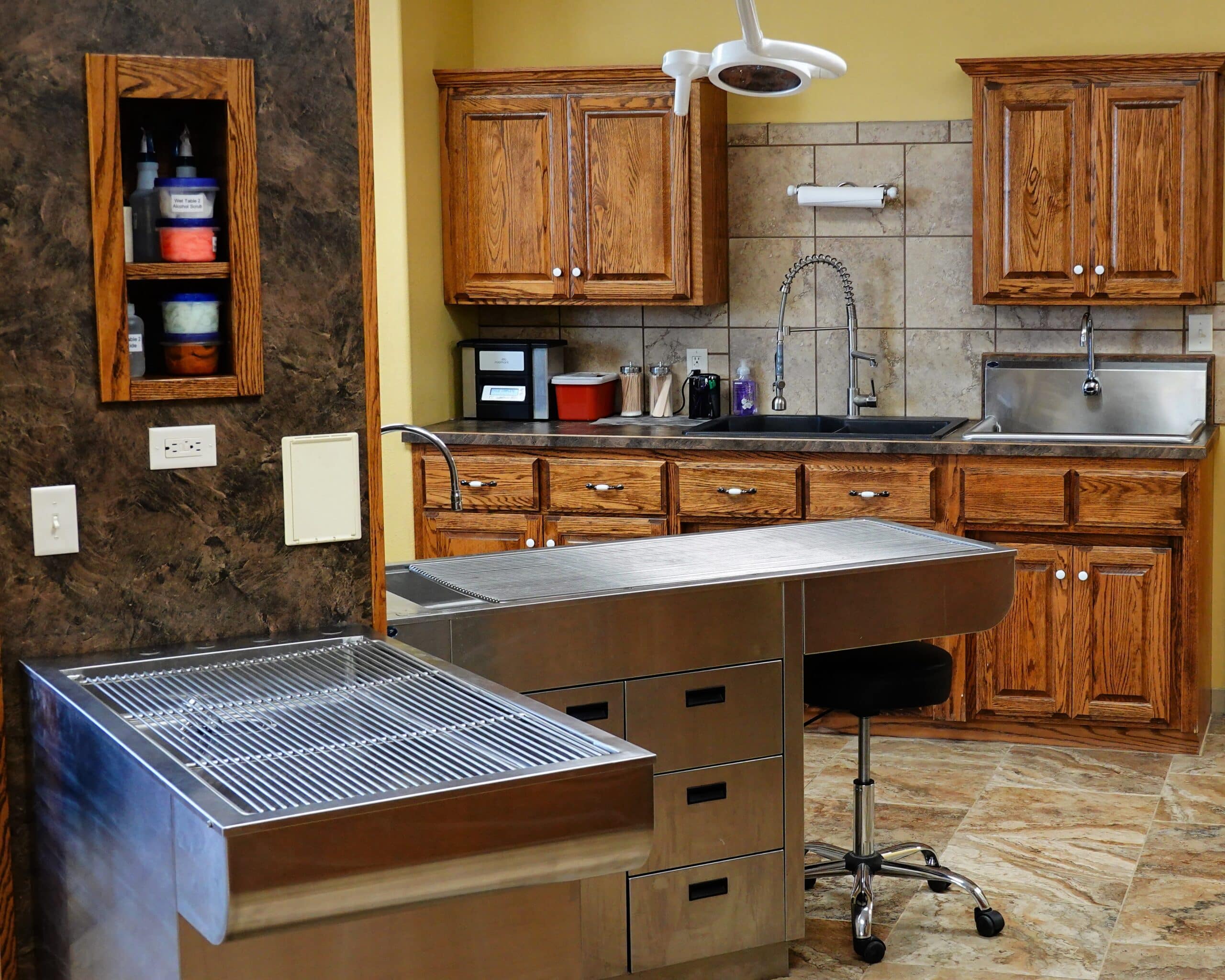 The treatment area is the hub of the patient care section of the hospital. Placed around the two wet prep tables are our ICU cages, nurse’s stations, the lab, and equipment prep. Radiology and ultrasonography areas are right next door.